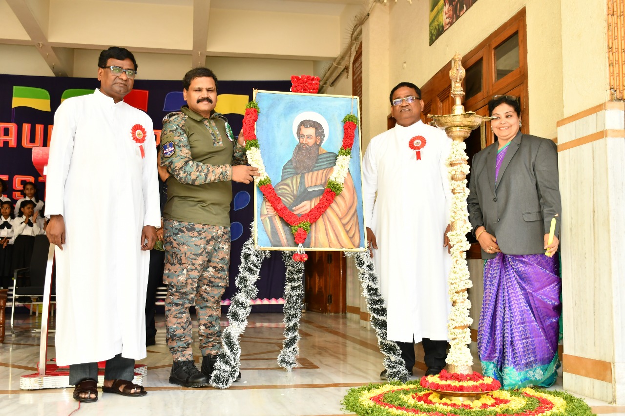 On June 28, St Paul’s High School orchestrated a grand Investiture Ceremony, seamlessly intertwined with the vibrant celebration of St Paul’s Feast Day. The illustrious alumnus, Additional Director General of Police, Greyhounds, Telangana Mr. Stephen Raveendra, IPS (Alumnus of St Paul’s High School 1988 batch ), graced the occasion, amidst an atmosphere of fervor and enthusiasm. Welcomed proudly by the School Principal, Rev. Bro. Sudhakar Reddy, the ceremony commenced with a majestic guard of honour, a soul-stirring prayer song, and the ceremonial lighting of the lamp.