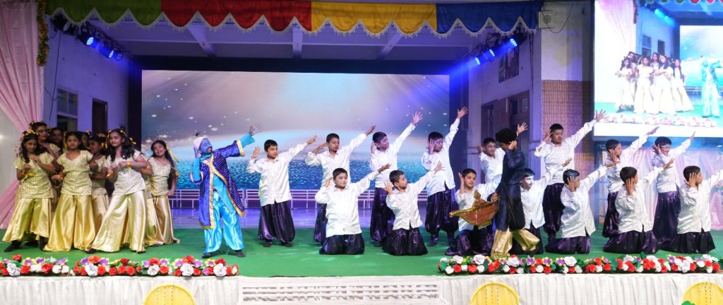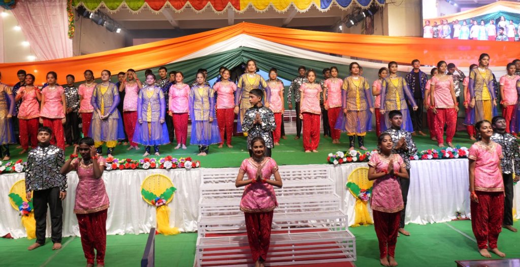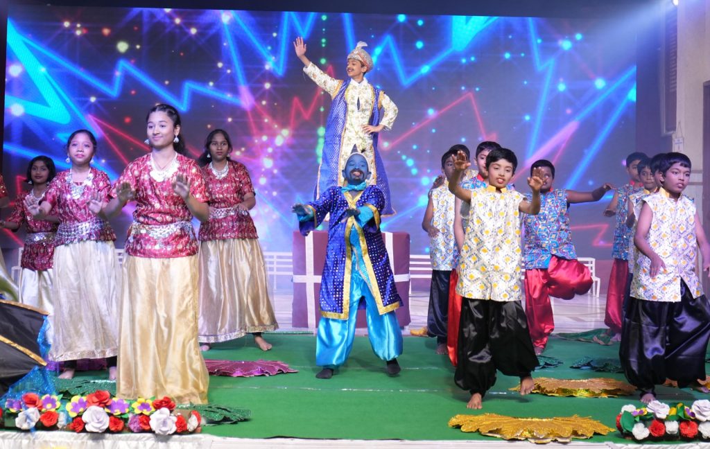 In his address the Chief Guest recollected his school days and motivated the students to aim high and aspire to be invited back as chief guests to the school.The Primary School Incharge, Rev. Bro. Chinnappa Reddy felicitated the Chief Guest with a shawl and the Principal presented a memento as a token of gratitude. The School Choir presented the Theme song based on the Theme of the Year – Build on your Strengths and Resonate your Success.The much awaited,vibrant cultural program filled the evening with festive mood. The students of classes 5 and 6 beautifully presented the musical play – Aladdin and the Magic Lamp, bringing the characters back to life on the stage followed by magnificent dance performance by the students of classes 7 and 8- Genesis Creation – In the Beginning, the beauty of God’s creation in 7 days. The Vote of Thanks was proposed by the General Secretary of the School Cabinet,G. Harshith Sarma.The program concluded with the grand finale Shakti—the strength that leads to success and channels that success toward a meaningful purpose for the nation which was beautifully portrayed by the students of classes 9 and 10 in a scintillating dance performance followed by the National Anthem