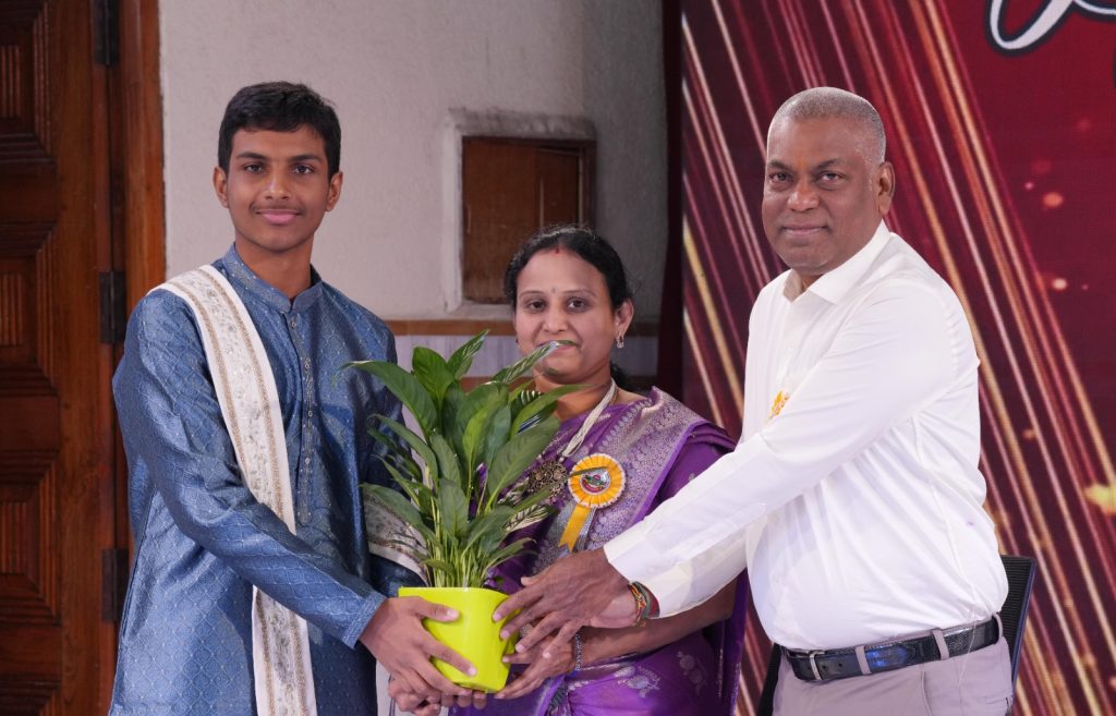 . Our Senior Physics and Mathematics teacher, Ms.M Sarvani has completed 25 years of dedicated service in the institution. As a token of appreciation Ms.M.Sarvani was felicitated by the Principal, Rev.Bro.Sudhakar Reddy, the Primary School Incharge Rev.Bro.Chinnappa Reddy, the Vice Principal Ms.Suju Thomas, the High School Coordinator Ms.Saraswati and by the senior Telugu teacher Ms. Nagarajya Lakshmi. The teachers who have relentlessly put in cent percent attendance for the year 2024-25- Ms.MadhuraVani, Ms.Stella Paul and Ms.Prarthana were honoured by the Principal and the Primary School Incharge.A total of 23 students from the batch of 2024 -25, were felicitated for securing highest marks and being the toppers in the individual subjects in the SSC Board Examinations. The Annual Report covering all the mile stones for the years 2024-25 was presented by the School Cabinet.