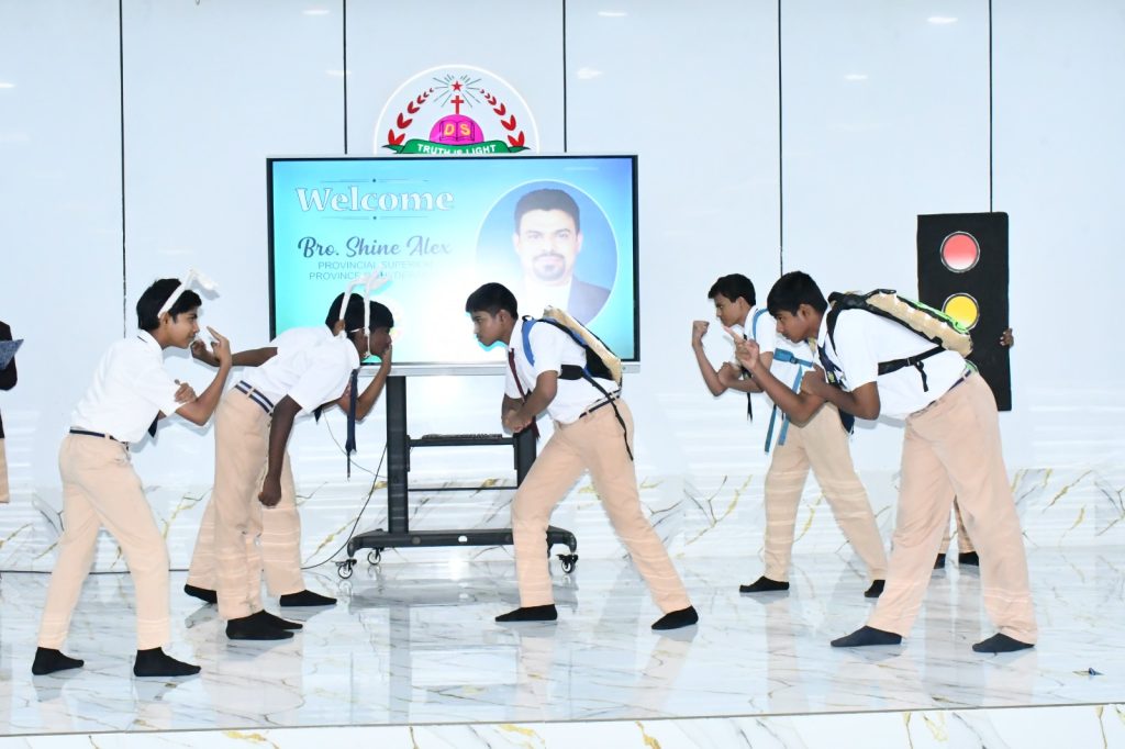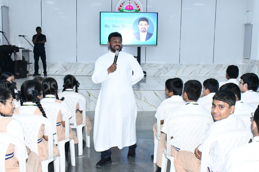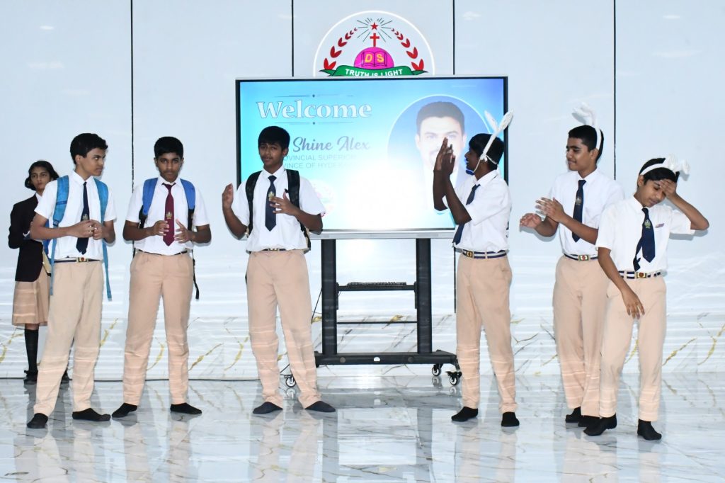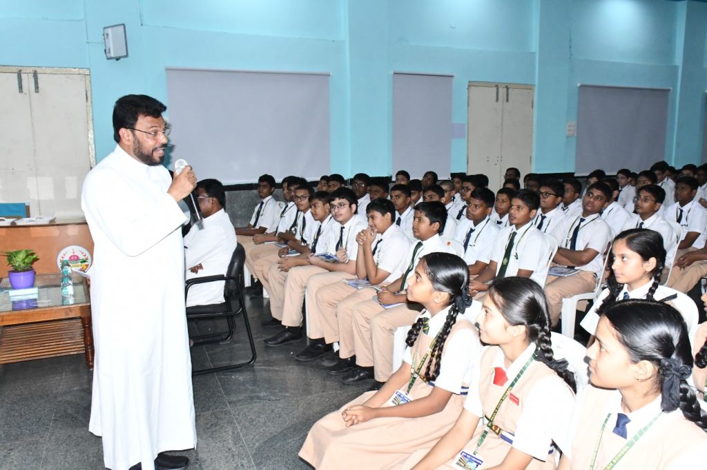 A special session was held on 10 October 2025 for Class 9 students. The event commenced with a prayer song and a heartfelt prayer, setting a solemn tone. Rev. Bro. Shine Alex, Provincial Superior of the Province of Hyderabad, was warmly welcomed with a sapling. A skit on “Hartoise” by the students highlighted teamwork and perseverance. The Provincial emphasized key success values: Collaboration ,Critical thinking,Competency, Creativity, Courage, Honesty, Humility, and Patience. An interactive session followed, where Rev. Bro. Shine Alex shared valuable insights with the students.